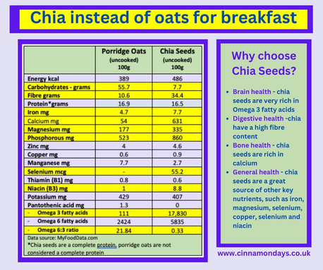Last night at the Low Carb Club we discussed the relative virtues of oats and chia. As I mentioned yesterday, chia seeds provide a lot of nutritional benefit - as not only are they are low in carbohydrates, they are also rich in fibre, omega 3 fatty acids, calcium, selenium and a num